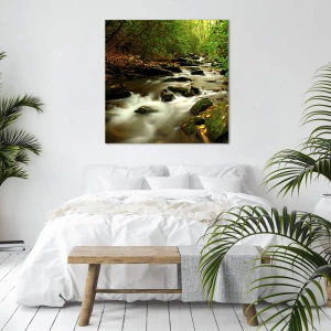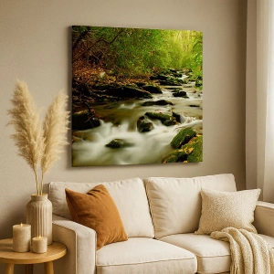 Obraz na płótnie - Leśny strumień płynący pomiędzy kamieniami otoczony zielenią - 120x80cm - Jak płynne srebro - Nowoczesna dekoracja ścienna do salonu, kuchni i sypialni ARTTOR