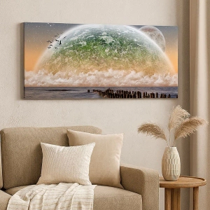 Dynamiczne połączenie kolorów zachodu słońca z chłodnym odcieniem morza i kosmicznej planety sprawia, że obraz wprowadza atmosferę harmonii i spokoju. Idealnie nadaje się do wnętrz urządzonych w nowoczesnym, romantycznym lub futurystycznym stylu, dodając im artystycznego charakteru.