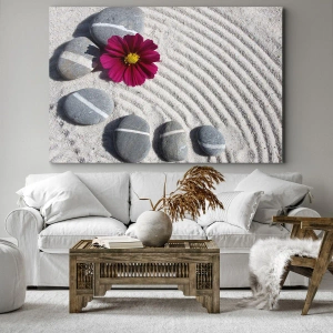 Obraz na płótnie - Kamienie i różowy kwiat na piasku w stylu zen - 120x80cm - Energia i spokój magicznego kręgu natury - Nowoczesna dekoracja ścienna do salonu, kuchni i sypialni ARTTOR
