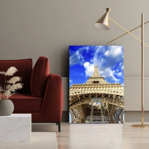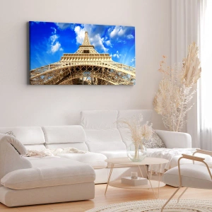 Obraz na płótnie - Wieża Eiffla z perspektywy dolnej na tle błękitnego nieba - 120x80cm - Sięgając nieba i chmur - Nowoczesna dekoracja ścienna do salonu, kuchni i sypialni ARTTOR