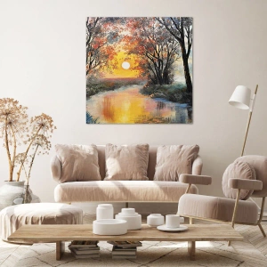 - Obraz przedstawiający jesienny krajobraz z zachodem słońca nad rzeką, otoczony drzewami w ciepłych barwach. Idealna dekoracja wprowadzająca spokój i harmonię.