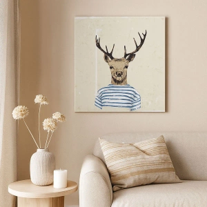 - Obraz przedstawia jelenia w koszulce w paski na jasnym tle z delikatną teksturą. Idealny dla miłośników humorystycznej sztuki w nowoczesnym stylu.