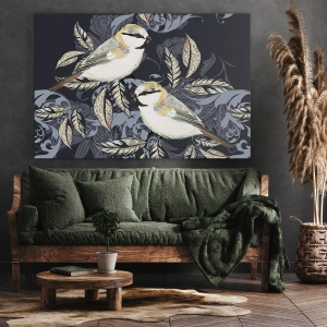 - Obraz przedstawiający dwa ptaki siedzące na gałęziach z ornamentowym tłem. Elegancki styl i subtelne detale wprowadzają harmonię i spokój do każdego wnętrza.