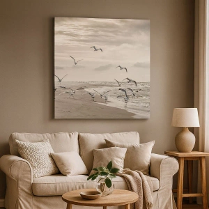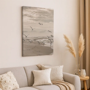 Obraz na płótnie - Mewa w locie nad nadmorskim krajobrazem - 120x50cm - Morza szum, ptaków śpiew - Nowoczesna dekoracja ścienna do salonu i sypialni ARTTOR