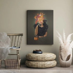 Kobieta w centrum obrazu jest otoczona elementami natury, które symbolizują piękno i bogactwo jesieni. Delikatne kwiaty, intensywny pomarańcz dyni oraz obecność kota dodają całości tajemniczego i eleganckiego charakteru. Kompozycja ta doskonale łączy tradycję z nowoczesnym stylem, tworząc unikalne dzieło artystyczne.