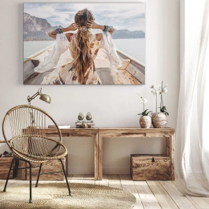Obraz na płótnie - Kobieta na łodzi z widokiem na góry i wodę, w stylu boho - 70x50cm - W drodze ku szczęściu - Nowoczesna dekoracja ścienna do salonu i sypialni ARTTOR
