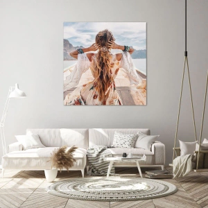 Delikatne detale sukni kobiety oraz jasne kolory obrazu wprowadzają ciepło i lekkość do przestrzeni, czyniąc go idealnym dodatkiem do salonów, sypialni czy przestrzeni biurowych. Obraz doskonale pasuje do wnętrz inspirowanych stylem boho, minimalistycznym lub nowoczesnym, podkreślając ich wyjątkowy charakter.