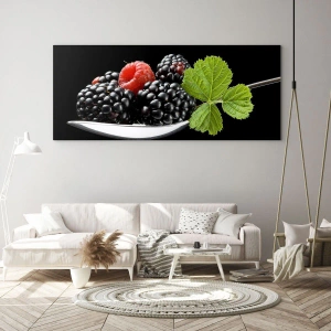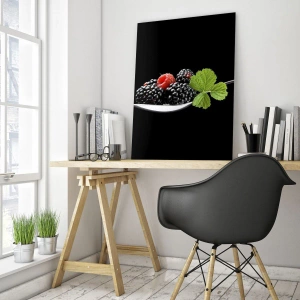 Obraz na szkle - Maliny i jeżyny na łyżce z zielonym liściem na czarnym tle - 100x70cm - Smak świeżości - Nowoczesna dekoracja ścienna do salonu, kuchni i sypialni ARTTOR