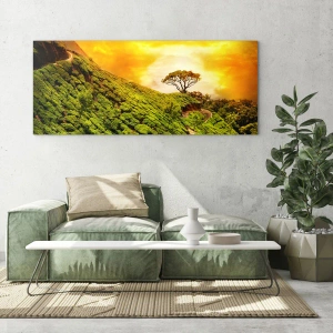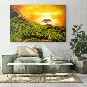 - Obraz na szkle przedstawia malownicze wzgórza pokryte zielenią z samotnym drzewem na szczycie. Zachód słońca w tle dodaje scenie ciepła i harmonii, tworząc piękną dekorację do wnętrz.