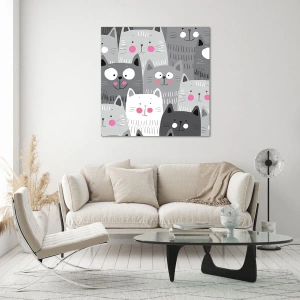 - Obraz na szkle przedstawiający zabawne koty w szarej kolorystyce na białym tle. Idealna dekoracja do pokoju dziecięcego lub wnętrz z nutą humoru.