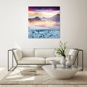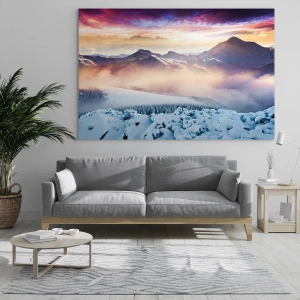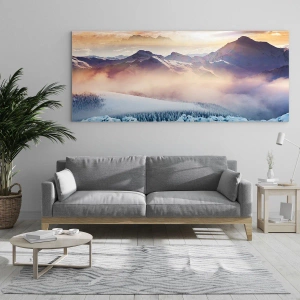 Obraz na ścianę - Siła i czystość natury - Górski krajobraz zimowy z zachodzącym słońcem i mgłą