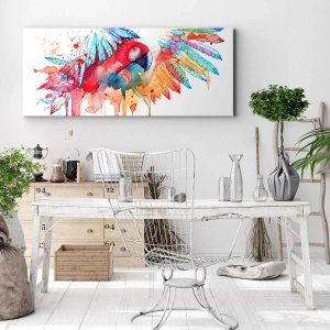 - Artystyczny obraz przedstawiający papugę w intensywnych kolorach wykonany techniką akwarelową. Zachwyca feerią barw i dynamicznym układem piór, wnosząc egzotyczny klimat do każdego wnętrza.