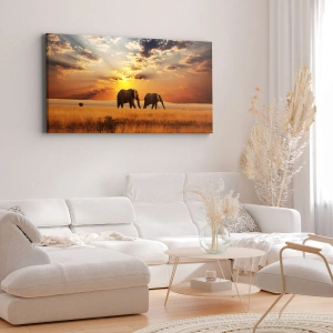Jeżeli szukasz dekoracji, która wprowadzi do Twojego wnętrza harmonię natury i egzotyczny urok, obraz na płótnie "Słonie na sawannie przy zachodzie słońca" to idealny wybór.