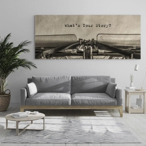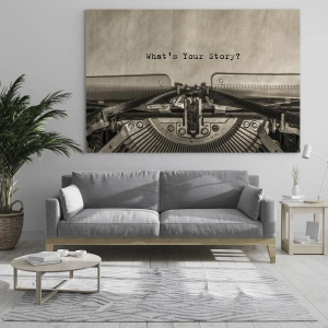 Obraz na szkle - Zbliżenie na maszynę do pisania z tekstem 'What's Your Story?' - 50x70cm - Opowiedz mi - Nowoczesna dekoracja ścienna do salonu, kuchni i sypialni ARTTOR