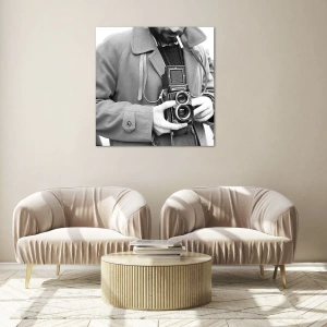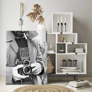 Obraz na szkle - Czarno-białe zdjęcie mężczyzny z aparatem retro - 70x100cm - W stylu retro - Nowoczesna dekoracja ścienna do salonu i sypialni ARTTOR