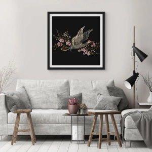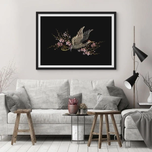 Plakat w czarnej ramie - Ptak w locie z kwiatami na czarnym tle - 100x70cm - Egzotyczny, haftowany ptak - Nowoczesna dekoracja ścienna do salonu i sypialni ARTTOR