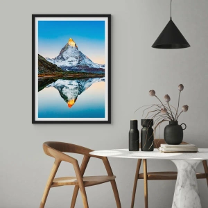 - Plakat przedstawia majestatyczny, ośnieżony szczyt góry odbijający się w spokojnej tafli jeziora. Czyste, niebieskie niebo i delikatne światło tworzą harmonię i poczucie spokoju.