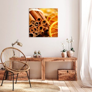 Obraz na płótnie - Cynamon i suszone pomarańcze w ciepłych kolorach - 50x70cm - Czujesz ich aromat? - Nowoczesna dekoracja ścienna do salonu, kuchni i sypialni ARTTOR