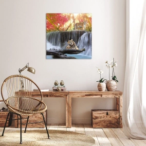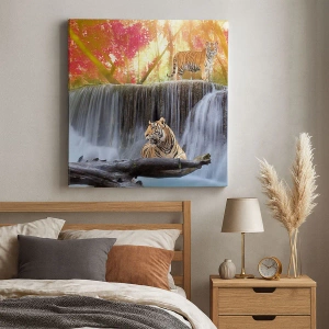 Obraz na płótnie - Tygrysy przy wodospadzie w jesiennym lesie - 70x100cm - Pejzaż surrealistyczny - Nowoczesna dekoracja ścienna do salonu i sypialni ARTTOR
