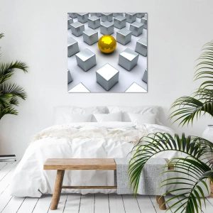 Obraz na płótnie - Złota kula wśród białych sześcianów - 50x70cm - Dlaczego ja? Kompozycja geometryczna - Nowoczesna dekoracja ścienna do salonu, kuchni i sypialni ARTTOR