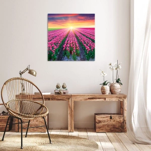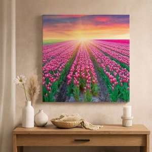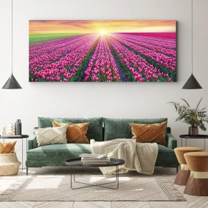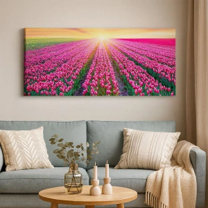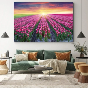 Obraz na płótnie - Pole tulipanów o zachodzie słońca - 80x120cm - Farma piękności - Nowoczesna dekoracja ścienna do salonu i sypialni ARTTOR