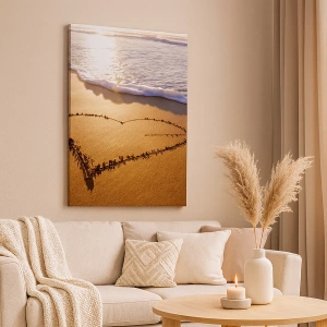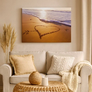 Obraz na płótnie - Serce z piasku na plaży podczas zachodu słońca - 80x120cm - Wakacyjne wyznanie - Nowoczesna dekoracja ścienna do salonu i sypialni ARTTOR