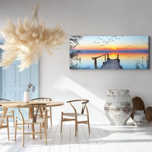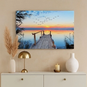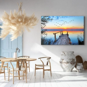Obraz na płótnie - Drewniany pomost na jeziorze o zachodzie słońca z lecącymi ptakami - 50x70cm - Pora wracać… - Nowoczesna dekoracja ścienna do salonu, kuchni i sypialni ARTTOR