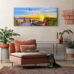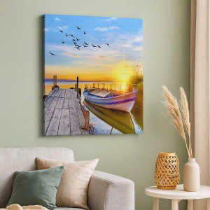 Obraz na płótnie - Łódka przy drewnianym pomoście o zachodzie słońca - 80x120cm - Do widzenia, do jutra - Nowoczesna dekoracja ścienna do salonu i sypialni ARTTOR