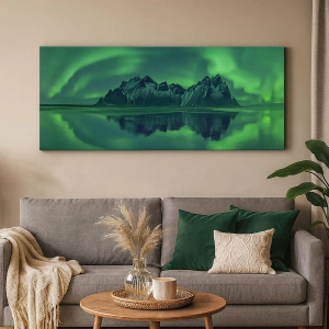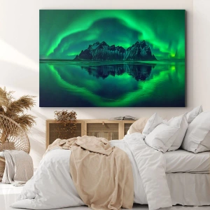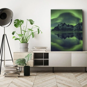 Obraz na płótnie - Góry otoczone zorzami polarnymi odbijającymi się w wodzie - 70x100cm - W ramionach zorzy - Nowoczesna dekoracja ścienna do salonu i sypialni ARTTOR