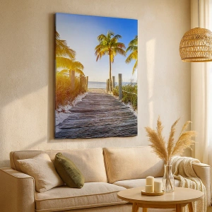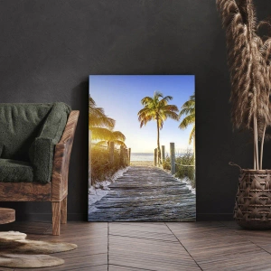 Obraz na płótnie - Drewniana ścieżka na plaży z palmami w tle - 80x120cm - Prosto do raju - Nowoczesna dekoracja ścienna do salonu i sypialni ARTTOR