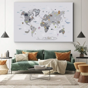 Obraz na płótnie - Mapa świata z ilustracjami zwierząt charakterystycznych dla różnych regionów - 50x70cm - Powiedz mi, skąd jesteś… - Nowoczesna dekoracja ścienna do salonu, kuchni i sypialni ARTTOR