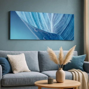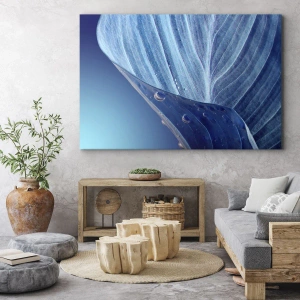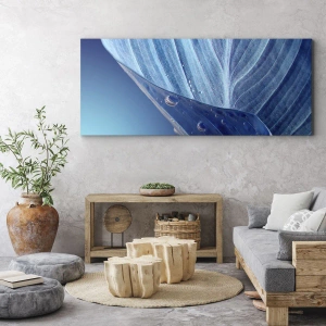 Obraz na płótnie - Błękitny liść z widocznymi kroplami wody - 70x100cm - Ukryte krople błękitu - Nowoczesna dekoracja ścienna do salonu i sypialni ARTTOR