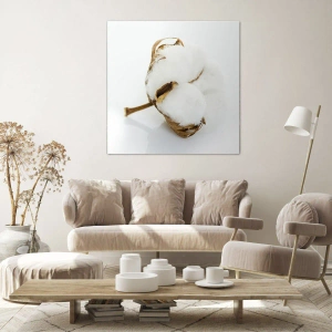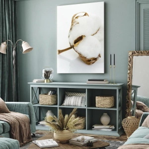 Jasne tło uwydatnia detale bawełny, takie jak miękkie włókna i subtelne kolory, tworząc wrażenie lekkości i harmonii. Taka dekoracja wprowadza do wnętrza spokój i naturalny urok, inspirując do refleksji i odpoczynku. To idealny wybór dla osób, które cenią kontakt z naturą i chcą wprowadzić jej elementy do swojego domu.