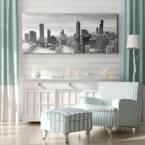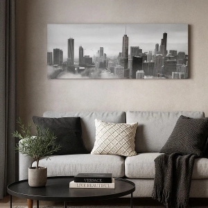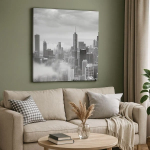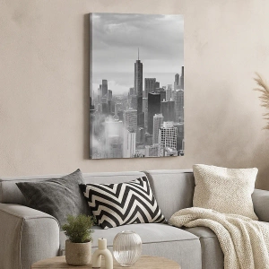 - Obraz ukazujący panoramę miasta z wieżowcami wśród chmur, utrzymany w czerni i bieli. Idealny wybór dla miłośników miejskich pejzaży i architektury.
