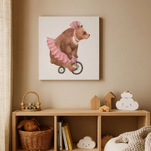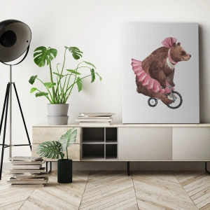 Ale cyrk! to zabawny i uroczy obraz o wymiarach 70x50 cm, który wnosi do wnętrz radość i lekkość. Przedstawia misia w różowej spódniczce i kokardce, jadącego na małym rowerku w stylu retro. Cała scena utrzymana jest w pastelowych kolorach, co nadaje kompozycji delikatności i harmonii, idealnie pasując do wnętrz o dziecięcym charakterze. To dekoracja, która rozwesela i inspiruje, zachęcając do zabawy i kreatywności.