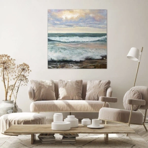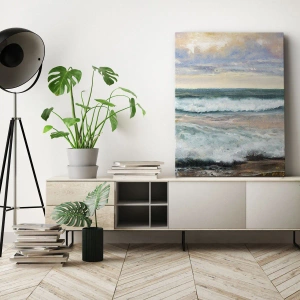 Obraz na płótnie - Morskie fale na tle zachmurzonego nieba o zachodzie słońca - 120x80cm - Tutaj wygładzisz duszę - Nowoczesna dekoracja ścienna do salonu, kuchni i sypialni ARTTOR
