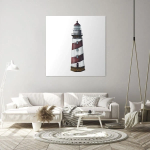 Obraz na płótnie - Rysunkowy obraz latarni morskiej z czerwono-białymi pasami na minimalistycznym tle - 120x80cm - Zawsze na straży - Nowoczesna dekoracja ścienna do salonu, kuchni i sypialni ARTTOR