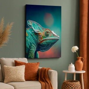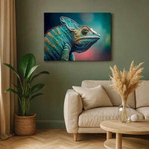Obraz na płótnie - Zbliżenie na kameleona w intensywnych kolorach - 70x100cm - Widzisz mnie? Niedobrze… - Nowoczesna dekoracja ścienna do salonu i sypialni ARTTOR