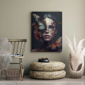 Obraz na płótnie - Portret kobiety z motylami i elementami roślinnymi - 140x50cm - Cudowna metamorfoza - Nowoczesna dekoracja ścienna do salonu i sypialni ARTTOR