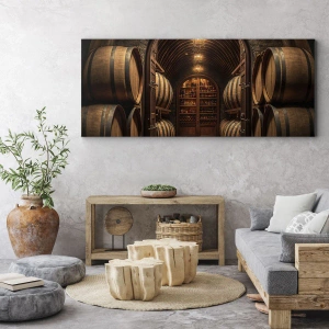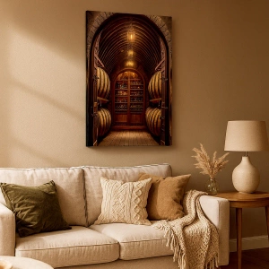 Obraz na płótnie - Winiarnia z drewnianymi beczkami i półkami z winami - 70x100cm - Klimatyczna piwnica - Nowoczesna dekoracja ścienna do salonu i sypialni ARTTOR