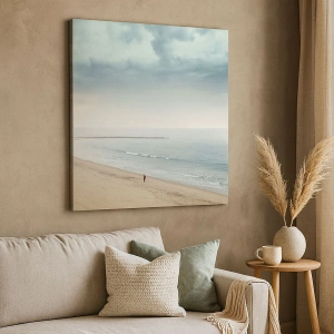 - Obraz przedstawiający samotną postać na pustej plaży przy spokojnym morzu. Minimalistyczny i uspokajający krajobraz wprowadza harmonię i elegancję do wnętrz, będąc idealnym dodatkiem do przestrzeni o subtelnym charakterze.
