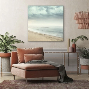 Obraz doskonale oddaje atmosferę ciszy i kontemplacji. Bezludna plaża i spokojne morze rozciągające się po horyzont tworzą przestrzeń do refleksji, inspirując do chwili wyciszenia w codziennym zgiełku. Monochromatyczna kolorystyka nadaje obrazowi elegancji i wyrazistości, podkreślając jego artystyczny charakter.