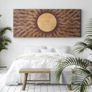 Obraz na płótnie - Stylizowane słońce z promieniami w odcieniach brązu i złota na teksturowanym tle - 50x70cm - Ikona słońca - Nowoczesna dekoracja ścienna do salonu, kuchni i sypialni ARTTOR