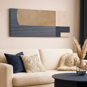Beżowe i granatowe elementy nadają obrazowi zbalansowanego charakteru, podczas gdy linie dodają mu dynamiki i wyrazistości. Tekstura oraz wyważone proporcje czynią dzieło unikalnym punktem dekoracyjnym, który doskonale współgra z nowoczesnymi aranżacjami wnętrz.