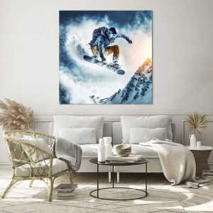 Obraz na szkle „Ekstremalne emocje” przedstawia moment pełen adrenaliny i energii – snowboardzista uchwycony w powietrzu podczas widowiskowego skoku nad ośnieżonymi górami. Kompozycja oddaje pełnię ruchu, siły i determinacji, która towarzyszy sportom zimowym. Dynamiczna poza postaci i rozpryskujący się śnieg podkreślają ekstremalny charakter sceny.