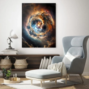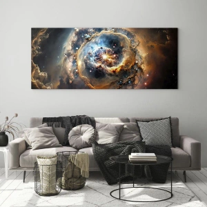 Obraz na szkle - Abstrakcyjna wizja kosmicznej eksplozji w odcieniach złota i błękitu - 160x50cm - Początek - Nowoczesna dekoracja ścienna do salonu i sypialni ARTTOR