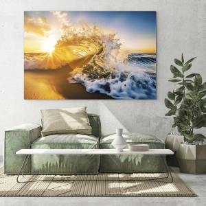 Obraz na szkle - Fala uderzająca o brzeg oświetlona promieniami zachodu - 100x70cm - Zabawa na piasku - Nowoczesna dekoracja ścienna do salonu, kuchni i sypialni ARTTOR