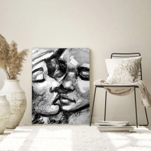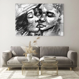 Obraz na szkle - Czarno-biały szkic przedstawiający czuły pocałunek - 120x80cm - Czuła chwila - Nowoczesna dekoracja ścienna do salonu, kuchni i sypialni ARTTOR