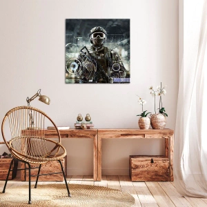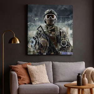 - Nowoczesny obraz przedstawiający żołnierza w futurystycznym hełmie z maską ochronną i bronią na tle zaawansowanych technologii. Dynamiczny motyw doskonale nadaje się do nowoczesnych wnętrz.
