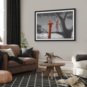 Plakat w czarnej ramie - Dziecko i żyrafa na gałęzi drzewa w bajkowym krajobrazie - 100x70cm - To się naprawdę dzieje - Nowoczesna dekoracja ścienna do salonu i sypialni ARTTOR